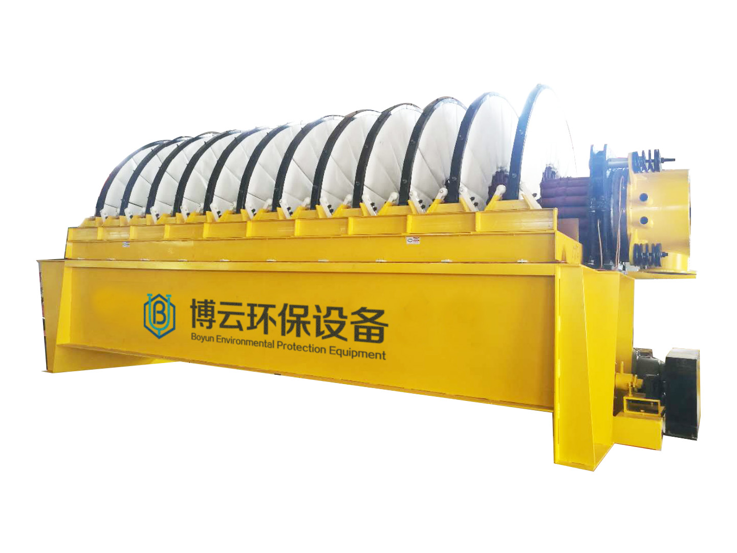 PG系列盤式真空過濾機 (1)扇形濾板脫水孔分布均勻,孔率合理,筋條尺寸大,由高強度工程塑料制成,壽命提高了2-3倍。 (2)濾液管過濾數(shù)面大,分配頭腹腔容積大,提高了抽氣率和濾液排放效果。 (3)耐磨錦綸、單或復(fù)絲濾布使脫餅率高且不易堵塞,使用壽命長。 (4)多點干油泵集中多點自動潤滑。 (5)濾布自動清洗裝置,保持了其良好的脫水效果。 (6)臥式強制高速攪拌、軸端采用橡膠及石墨盤根和水壓差三重密封不漏漿。 (7)主傳動無級變速,依物料的濃度及流量調(diào)節(jié)(交流調(diào)速電機或變頻器),以求達到理想的工作效果 。 (8)每盤由20片扇形板組成,加強了過濾過程控制,成餅厚度均勻。 (9)磨擦片采用特制耐磨硼鑄鐵,剛?cè)嵯酀芊饧?,使用壽命達到十年以上。 (10)濾液管為高強度耐磨陶瓷復(fù)合鋼管,提高壽命10倍以上。 (11)濾液管與濾扇接口去掉下法蘭,采取模具定位直接焊接,減少了90%可能的漏氣點。