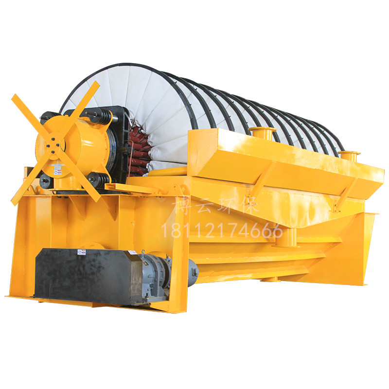 盤式真空過濾機由各個單獨的扇形片的圓盤構成。每一個扇形片為 單獨的過濾單元,由濾布做成布套在扇形片上形成濾室。過濾盤由電機通過減速器及開式齒輪傳動來驅動 ,過濾盤順時針方向轉動,濾室里的礦漿在吸附區(qū)借助于真空泵在過濾介質兩側形成的壓力差,附著在過 濾盤上形成濾餅后,攪拌器旋轉防止固體沉淀,濾餅離開液面后,在真空作用下繼續(xù)脫去水分。濾液透過 濾布,經過濾液管,從分配頭排出。濾餅在卸料區(qū)由反吹風卸料落入排料槽,整個作業(yè)過程連續(xù)循環(huán)進行 。