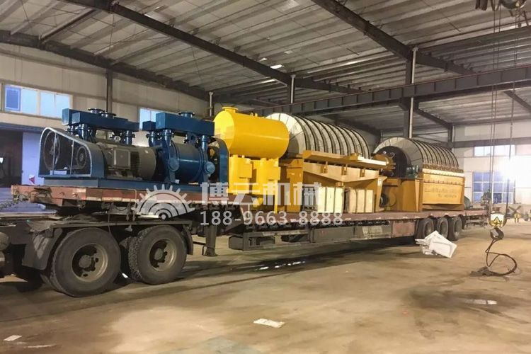 盤式真空過濾機由各個單獨的扇形片的圓盤構(gòu)成。每一個扇形片為單獨的過濾單元,由濾布做成布套在扇形片上形成濾室。過濾盤由電機通過減速器及開式齒輪傳動來驅(qū)動,過濾盤順時針方向轉(zhuǎn)動,濾室里的礦漿在吸附區(qū)借助于真空泵在過濾介質(zhì)兩側(cè)形成的壓力差,附著在過濾盤上形成濾餅后,攪拌器旋轉(zhuǎn)防止固體沉淀,濾餅離開液面后,在真空作用下繼續(xù)脫去水分。濾液透過濾布,經(jīng)過濾液管,從分配頭排出。濾餅在卸料區(qū)由反吹風(fēng)卸料落入排料槽,整個作業(yè)過程連續(xù)循環(huán)進行。