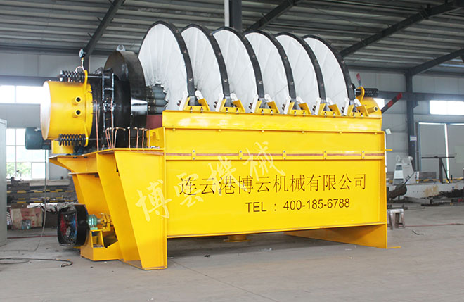 盤式真空過濾機由各個單獨的扇形片的圓盤構成。每一個扇形片為單獨的過濾單元,由濾布做成布套在扇形片上形成濾室。過濾盤由電機通過減速器及開式齒輪傳動來驅動,過濾盤順時針方向轉動,濾室里的礦漿在吸附區(qū)借助于真空泵在過濾介質兩側形成的壓力差,附著在過濾盤上形成濾餅后,攪拌器旋轉防止固體沉淀,濾餅離開液面后,在真空作用下繼續(xù)脫去水分。濾液透過濾布,經過濾液管,從分配頭排出。濾餅在卸料區(qū)由反吹風卸料落入排料槽,整個作業(yè)過程連續(xù)循環(huán)進行。